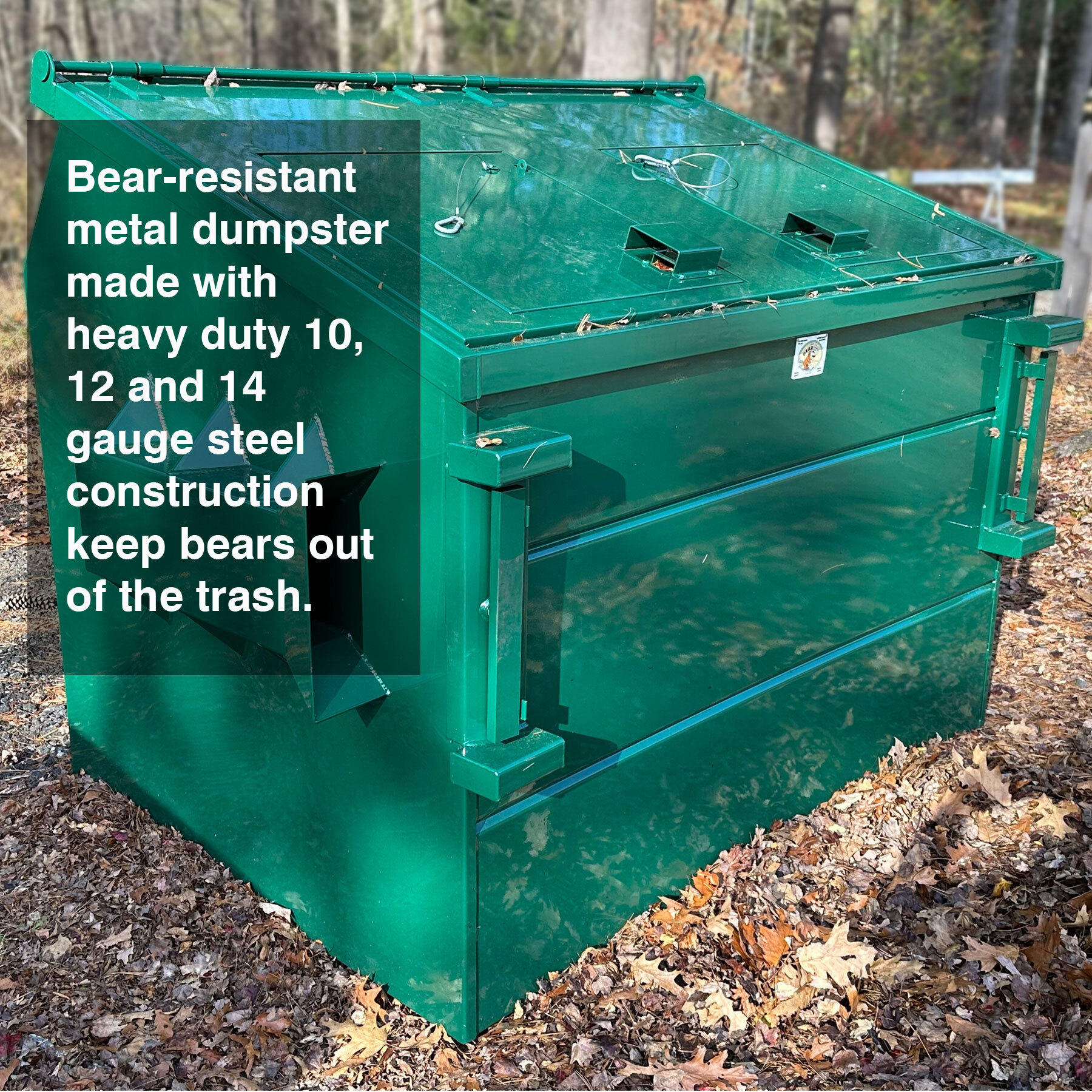 All‑metal bear‑resistant dumpster (steel body + steel lids) |